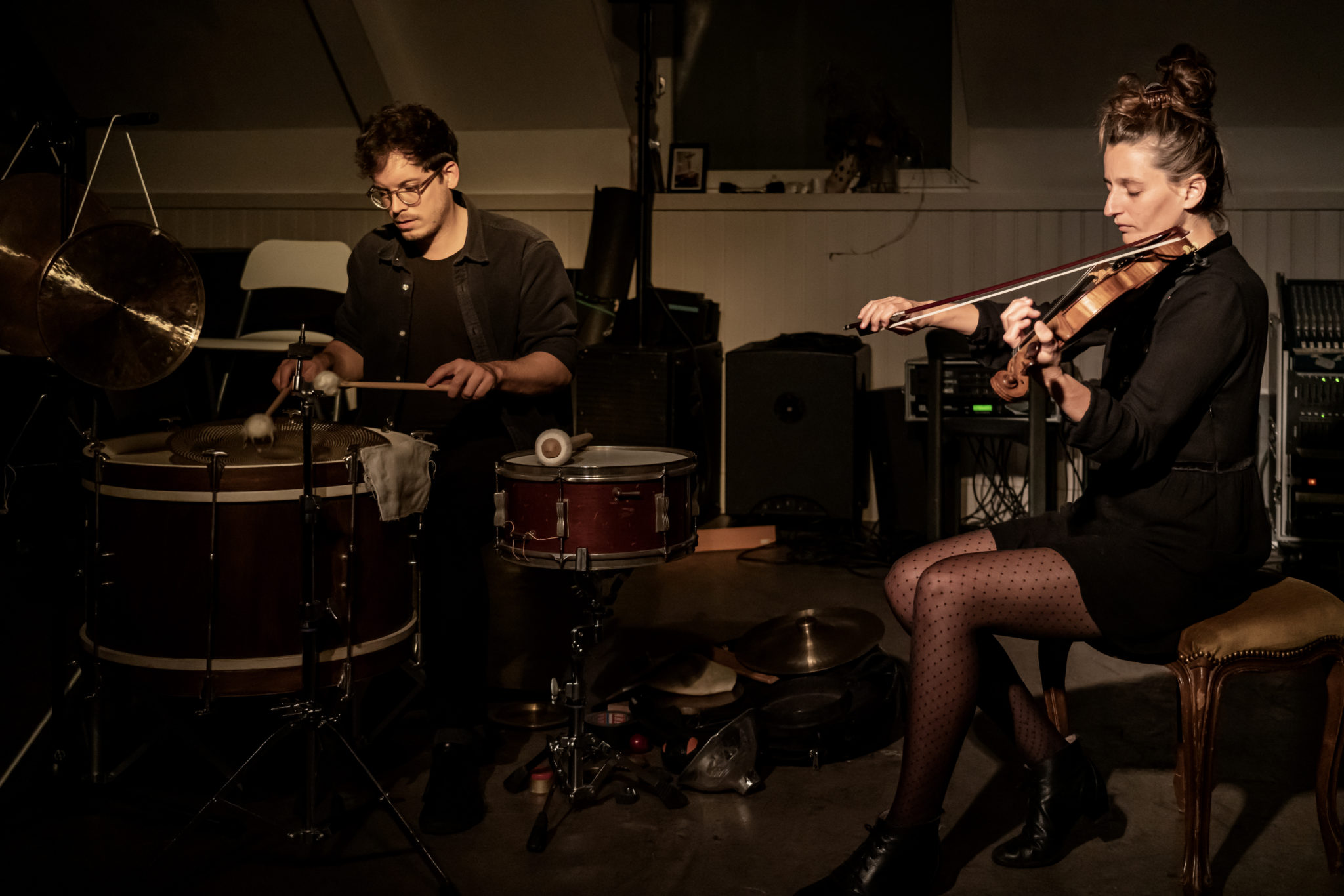 Le duo Genthon_Meier s'est fondé sur le désir mutuel de combiner des modes de jeu singuliers prédéfinis initialement pour l'un et l'autre. Dans cette perspective, David Meier se focalise uniquement sur la grosse caisse de son instrument en tant que résonateur et amplificateur d'objets trouvés, cherchant ainsi de nouvelles libertés dans une limitation consciemment choisie. Anouck Genthon approfondit quant à elle au violon une recherche sonore liée au jeu et au timbre spécifique d'une vièle monocorde touarègue dont elle a étudié la musique en tant qu'ethnomusicologue des années plus tôt. Le croisement de ces deux approches sonores distinctes donnent à entendre une musique texturelle qui se fond tant dans un flux sonore en continuelle transformation que dans une tension particulière liée aux fortes oppositions de leurs instruments respectifs.